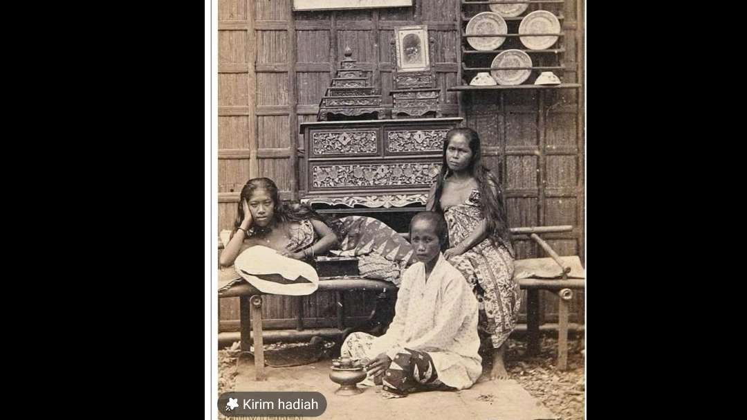 Foto ini adalah potret yang begitu kuat dan memikat dari Batavia (kini Jakarta) pada tahun 1870. Di dalamnya tampak tiga perempuan pribumi yang duduk dalam formasi yang tenang namun penuh makna. Mereka mengenakan kain batik dan kebaya sederhana—busana khas perempuan Nusantara masa itu—dengan latar belakang rumah bambu berdinding anyaman dan perabot ukiran yang menunjukkan nuansa lokal yang kaya budaya.